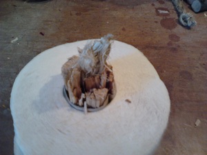 Den Tampen in Wachs tauchen und gut vollsaugen lassen. Wieder aus dem Wachs nehmen und hart werden lassen.