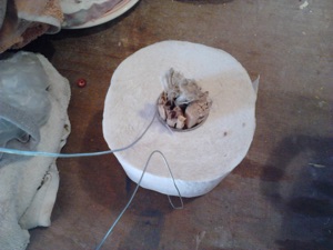 Den Bindedraht durch die Mitte durchführen und einen Henkel formen, um nach dem Tauchen die Rolle wieder aus dem Topf zu bekommen.
